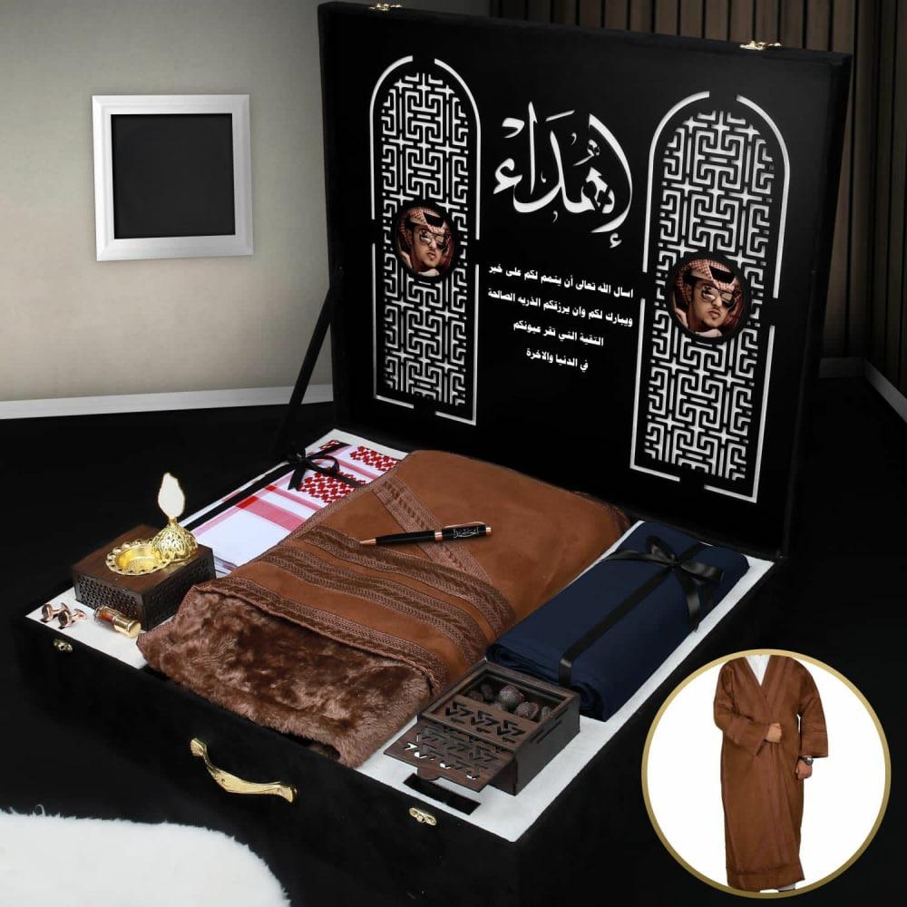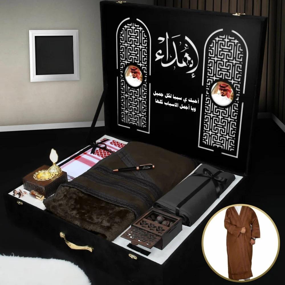 - يتكون البوكس من : (قماش شتوي عالي الجودة مع الملحقات 8 زراير مع علامتين الجيب والرقبة - شماغ آخر اصدار خامة سوبر ديلوكس - فروة شامواه صناعة سورية - كبك أنيق - قلم بالإسم نحت ليزر - مبخرة خشبية أنيقة - علبة بخور - ربع تولة عودة - بوكس إهداء فخم مع براوز خشبي داخلي نفس الصورة).