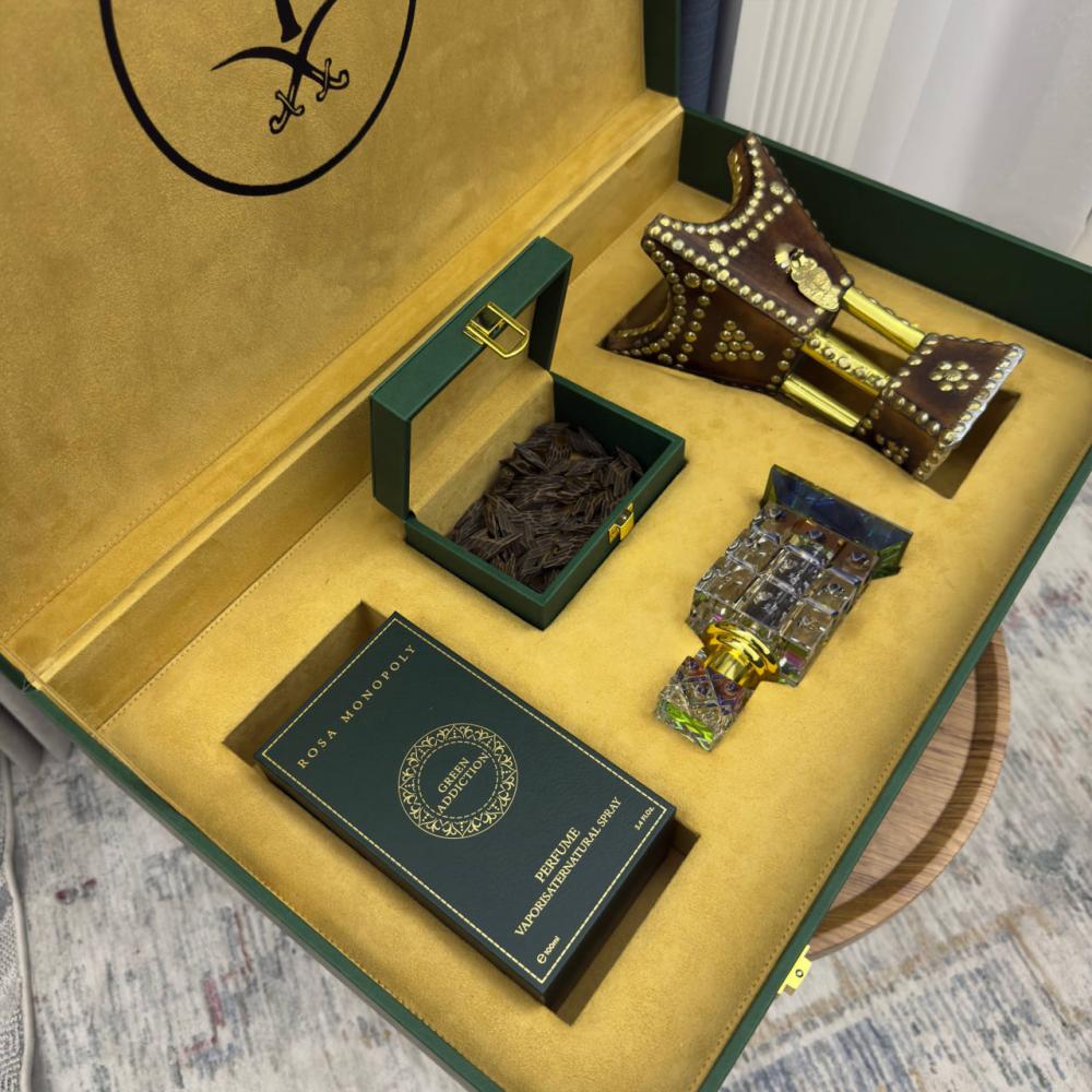 - بوكس جلد أخضر ملكي بشعار السيفين والنخلة
